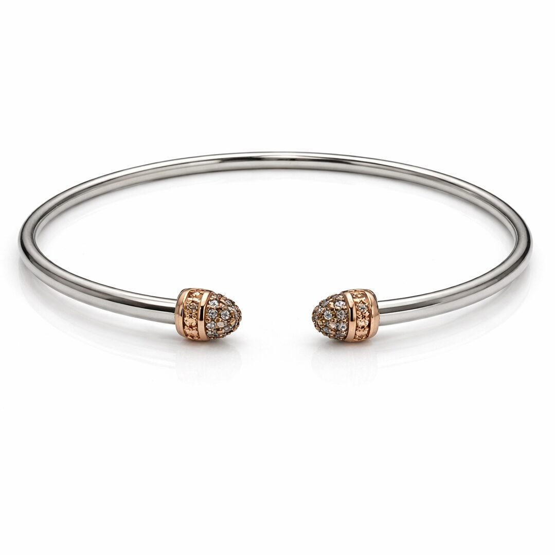 • Adornos en plata bañados en oro rosa.